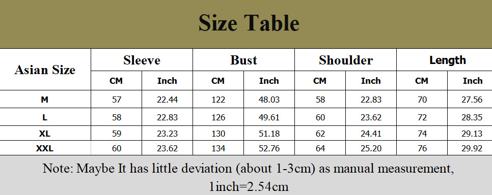 Note: 1. Asian sizes are 1 to 2 sizes smaller than European and American people. Choose the larger size if your size between two sizes. Please allow 2-3cm differences due to manual measurement. 2. Please check the size chart carefully before you buy the item, if you don’t know how to choose size, please contact our customer service. 3.As you know, the different computers display colors differently, the color of the actual item may vary slightly from the following images.